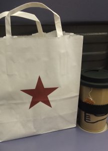 Because we are still living on a plastic planet, and because I try to re-use stuff rather than throw it away, I then wrapped it in a plastic mailing bag I’d brought with me to avoid coffee drips in my bag. I usually put a napkin or bit of kitchen roll inside too – to soak up any drips.