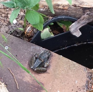 He’d been concerned about how tiny froglets would get out of the flexi bucket and so had gently and carefully installed a ramp for when the day came that they needed it. The tadpoles barely noticed, but it clearly drew the attention of some adult frogs. Apparently five popped out at one point, but by the time I went to see what was holding my husband’s attention only two were still in evidence (see pic above with blue arrows pointing to frogs!).