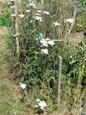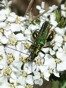 Today’s thick thighed flower beetle was on my husband’s allotment plot. No, of course I’m not jealous that it wasn’t on mine. I thought the plant it was on (pictured right) was yarrow, but looking at the leaves I’m not quite sure. A variety of yarrow, if not the common wild type. In any case this is all about the beetles. There were several and one obligingly posed to have its picture taken. Add to this the watering, raking and some weeding I did on my plot and it think it’s not too bad for a morning’s work.
